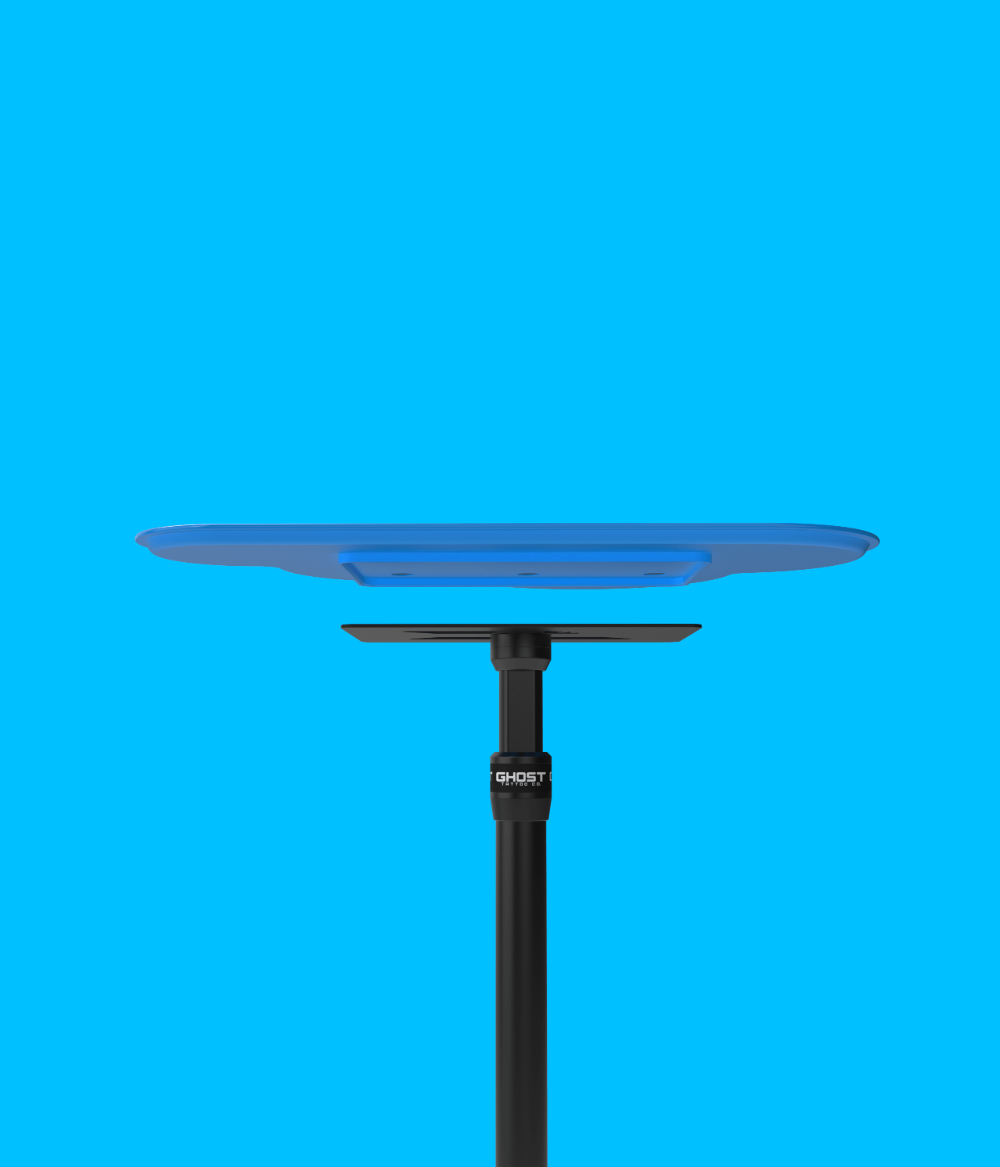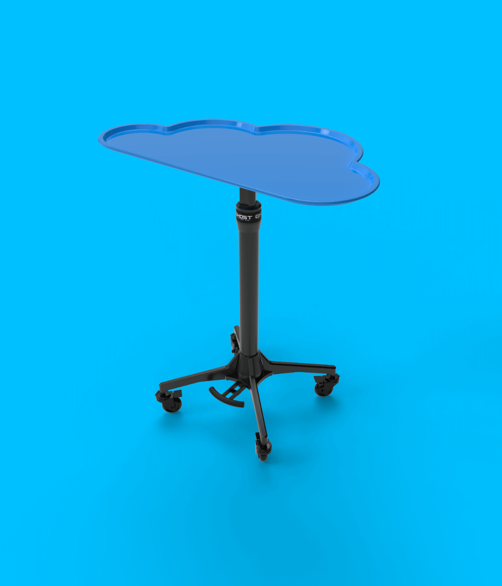 The Ghost Tray base offers an industry-first, foot lever actuation for hands-free height adjustment (24in - 36in) and a magnetic, removable, tray top - 14.6in x 25.2in